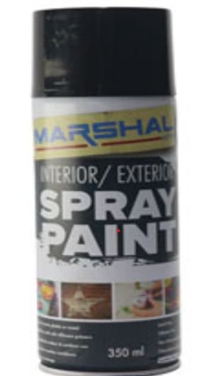 Marshal Spray Paint Gloss Black 350ml 1100M is an interior and exterior spray paint suitable for wood, plastic, or metal surfaces. This paint offers excellent adhesion and durability, making it ideal for various DIY projects and professional applications. It is lead-free, toluene-free, non-chlorinated, and provides a smooth, even coverage with high weather resistance. The 350ml can is equipped with a comfort nozzle for ease of use.